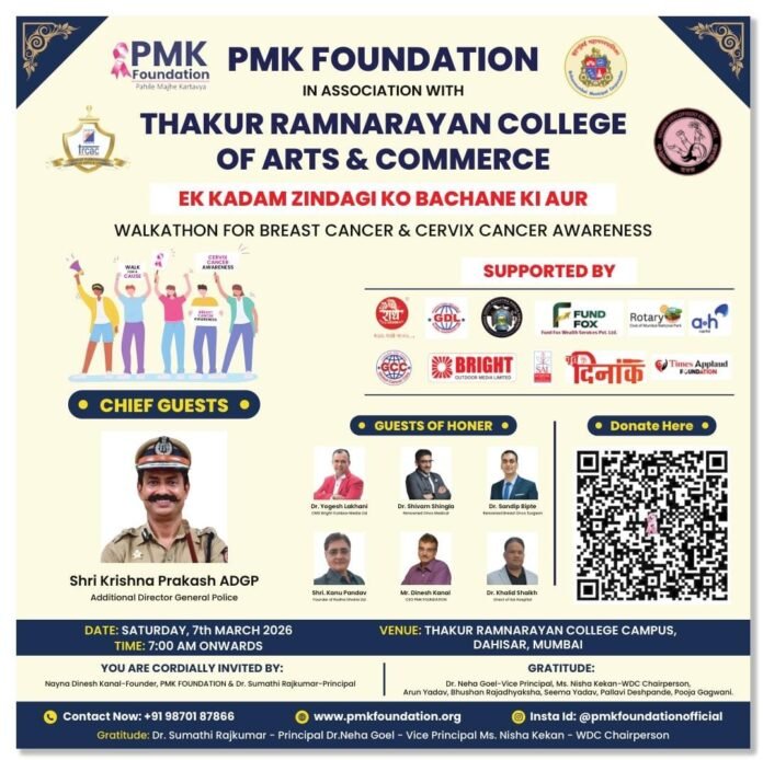 In a powerful initiative to spread awareness about women’s health, the PMK Foundation, in association with Thakur Ramnarayan College of Arts & Commerce, Dahisar, is organizing a meaningful Walkathon on 7th March dedicated to Breast and Cervical Cancer Awareness. Event Supported by the Times Applaud Foundation, the event carries a simple yet powerful message: “Walk for Awareness, Walk for Life.”