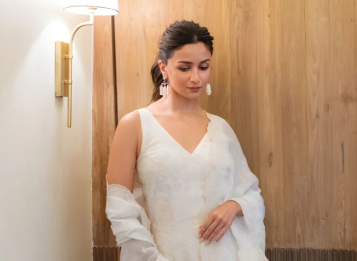 Alia’s ivory kurta was delicate and feminine. Made from sheer fabric, it featured detailed lace embroidery along the neckline and sleeves. The kurta gently skimmed her frame and was layered over a matching inner, blending seamlessly into the voluminous salwar. A light dupatta with scalloped lace edges completed the outfit, adding softness and movement.