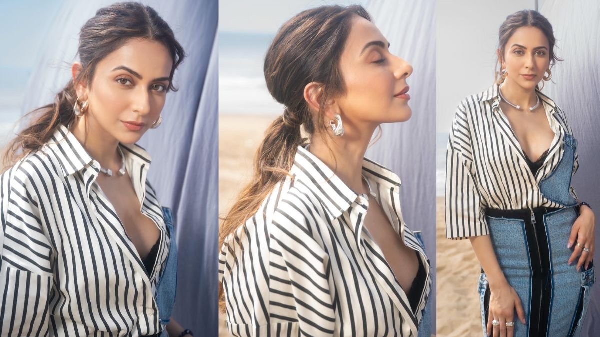 Rakul chose an outfit designed by Kanika Goyal that perfectly captured her refined yet fun fashion sensibility. She wore a crisp white striped shirt featuring an eye-catching denim patch pocket, paired with a high-waisted pencil skirt in matching tones. The ensemble was businesslike at first glance, but a closer look revealed a sense of ease and individuality. The shirt was left partly unbuttoned to reveal a delicate black lace bralette, adding a hint of casual glamour without overpowering the look. The skirt, fitted and structured with a sleek zipper and side pockets, brought sophistication and balance to the ensemble.