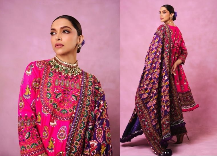 Deepika’s hair and makeup were kept simple to let the outfit shine. She opted for a sleek, centre-parted bun, which kept the focus on the clothes. Her makeup featured softly defined eyes and neutral lips, adding just the right amount of polish without taking attention away from the vibrant ensemble.