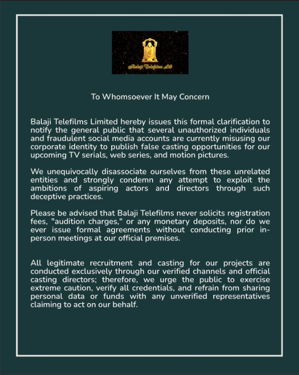 All legitimate casting for Balaji projects, the statement confirmed, is handled exclusively through verified channels and official casting directors.