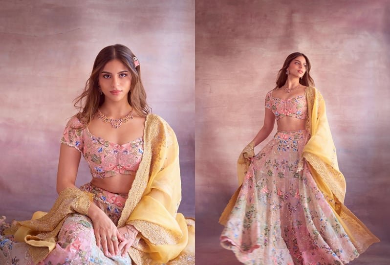 Styled by celebrity stylist Ami Patel, Suhana’s blush pink choli came with a sweetheart neckline and short sleeves. The blouse was decorated with colourful floral embroidery in soft shades like lilac, blue, green, and ivory, creating a delicate garden-like pattern.