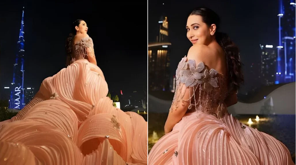Karisma wore a peach-toned gown that stood out for its sheer scale and detail. The dress featured a dramatic, voluminous skirt with sculpted pleats that flowed like waves, creating a sense of movement even in still photos. The off-shoulder neckline was decorated with intricate floral designs and tiny crystal accents that added softness and sparkle. As she posed against the glowing Dubai skyline, the rhinestones on the gown caught the light, making the outfit look almost magical.