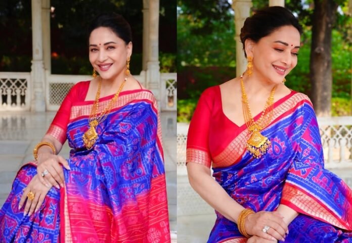 Madhuri wore a richly woven Odisha silk saree in a bold combination of royal blue and fuchsia. The deep cobalt blue base gave the look an elegant, luxurious feel, while traditional motifs like shankha, chakra, and delicate floral patterns added cultural depth.
