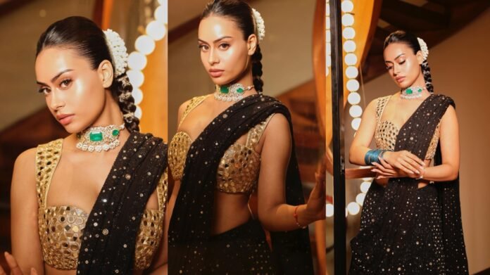 For this outing, Nysa wore a black sequinned saree by ITRH—an outfit that shimmered just enough to catch the light without slipping into excess. The sequins were placed close together, giving the fabric a liquid-like glow that felt controlled and elegant. A hint of sheerness in certain areas added depth, and the drape was kept simple so the fabric’s beauty could speak on its own.