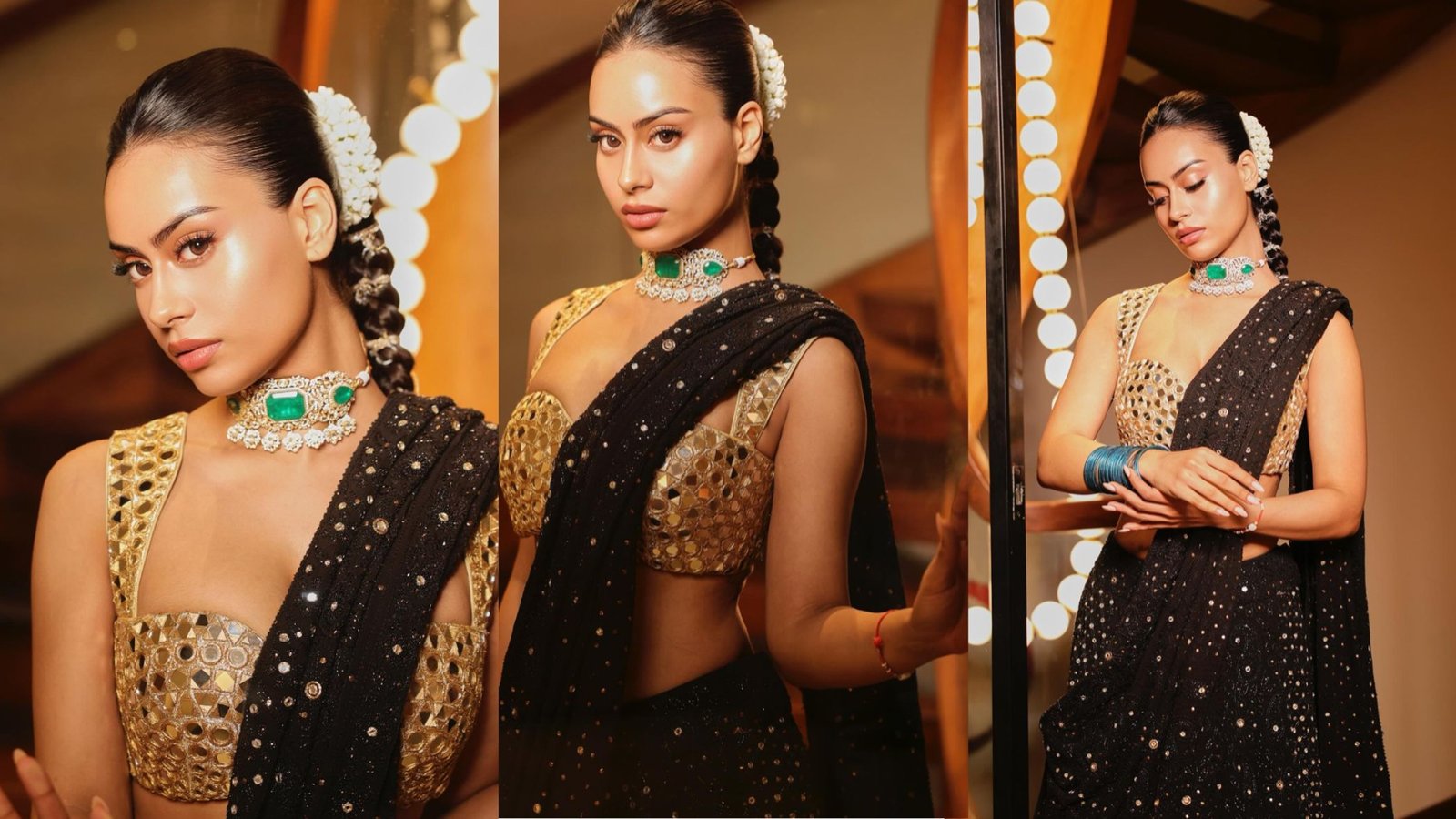 Nysa Devgan Radiates Midnight Glamour In A Black Sequinned Saree & Gold Blouse