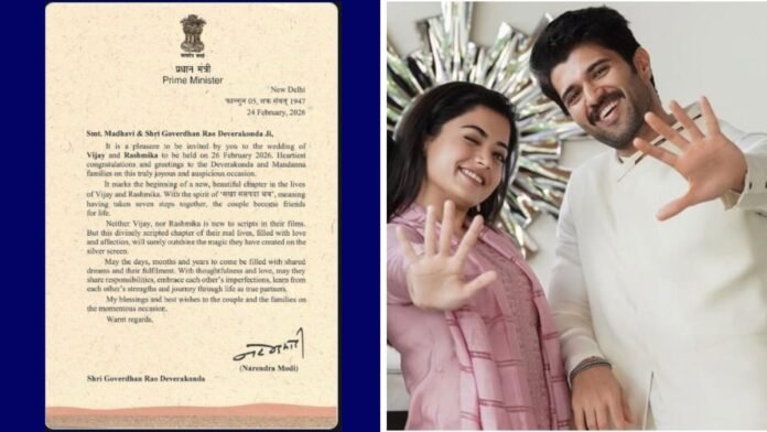 Prime Minister Modi sent a personal letter to Vijay Deverakonda’s parents, acknowledging the wedding invitation and expressing his warmest congratulations. In the letter, he wrote, “It is a pleasure to be invited by you to the wedding of Vijay and Rashmika to be held on 26 February 2026. Heartiest congratulations, and greetings to the Deverakonda and Mandanna families on this truly joyous and auspicious occasion.”