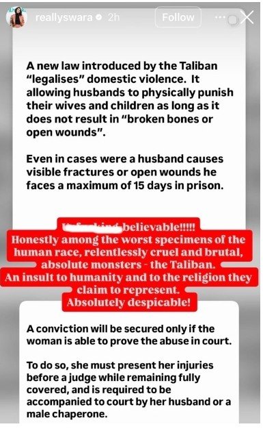 Bollywood actress Swara Bhasker has issued a furious public response to the Taliban’s newly signed penal code. She posted her reaction on Instagram Stories on Friday, and her words cut straight to the point.