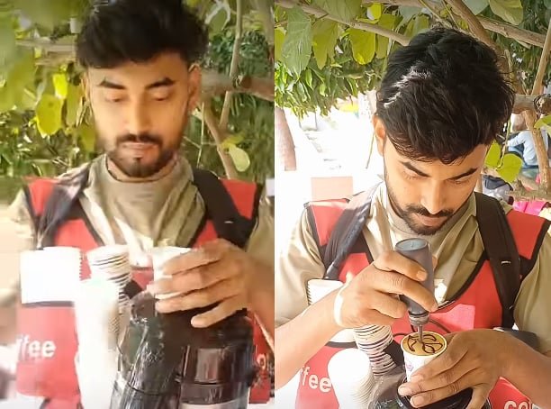 In a video shared on social media, the vendor is seen standing under a tree on a chilly winter day, calmly preparing hot coffee for his customers. What makes the moment special is not just the drink, but how effortlessly he manages everything on his own. Without a cart or stall, he carries all his supplies neatly strapped around his body, turning himself into a fully functional mobile coffee station.