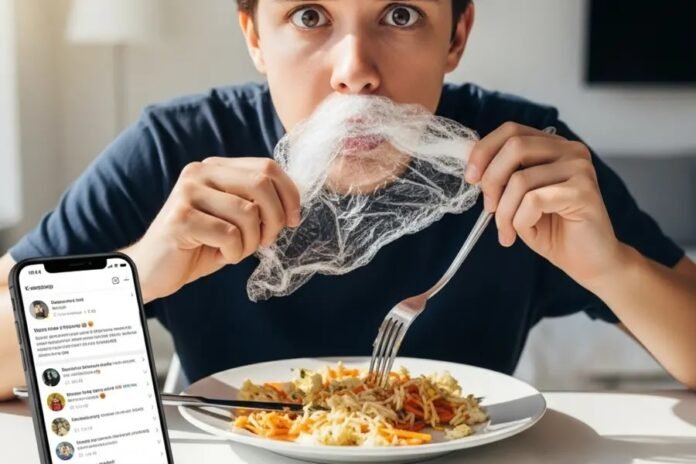 In China, some young users have begun following what is being called the “plastic eating” or “cling wrap diet”. The trend has spread quickly on TikTok, Douyin, and X, where short clips show participants wrapping plastic over their mouths, placing food inside, chewing it, and then spitting it out instead of swallowing.